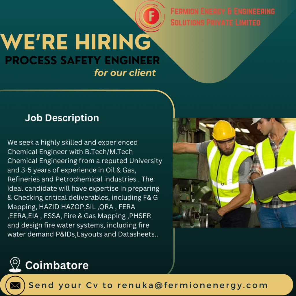 Process Safety Engineer Job Vacancy Job Category: Process Safety Engineer Job Vacancy Job Type: Full Time Job Location: Coimbatore Email: renuka@fermionenergy.com Apply for this position Full Name *Email *Phone *Cover Letter *Upload CV/Resume *Allowed Type(s): .pdf, .doc, .docxBy using this form you agree with the storage and handling of your data by this website. *