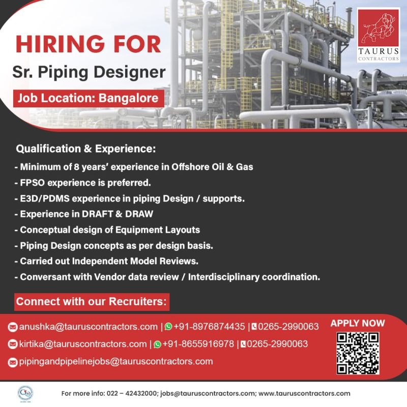 Sr. Piping Designer Job Vacancy Please send your resumes to given email id only. Please don’t upload the resumes in the website. Job Category: Sr. Piping Designer Job Vacancy Job Type: Full Time Job Location: Bangalore Email: anushka@tauruscontractors.com Apply for this position Full Name *Email *Phone *Cover Letter *Upload CV/Resume *Allowed Type(s): .pdf, .doc, .docxBy using this form you agree with the storage and handling of your data by this website. *